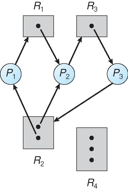 - \(P_2\):持有 \(R_1\) 和 \(R_2\) 各一个实例,正在请求 \(R_3\)。