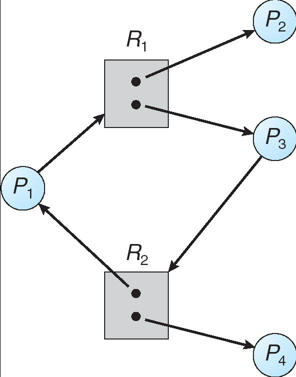 - Circular wait: there exists a set { \(P_0\) , \(P_1, …, P_n\) } of waiting processes such that \(P_0\) is waiting for a resource that is held by \(P_1\), \(P_1\) is waiting for a resource that is held by \(P_2\) , … , \(P_{n-1}\) is waiting for a resource that is held by \(P_n\) , and \(P_n\) is waiting for a resource that is held by \(P_0\).