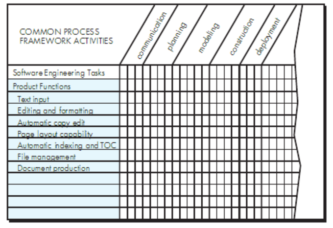 - 每一项软件工程任务都需要在不同的过程活动中得到关注和落实。例如,“文本输入”不仅需要在建模和构建阶段考虑,也要在沟通和计划阶段明确需求。