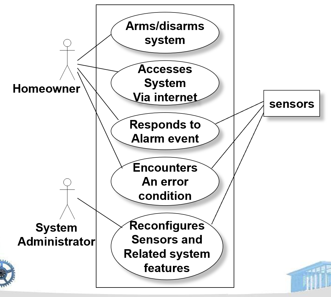- 典型参与者:房主(Homeowner)、系统管理员(System Administrator)、传感器(Sensors,作为外部设备/事件源)、监控机构(Monitoring Agency)。