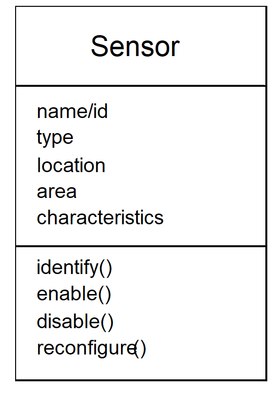 - 属性示例:name/id、type、location、area、characteristics(传感器标识、类型、安装位置、覆盖区域、特性);