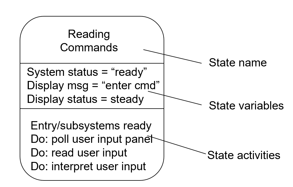 状态图元素:状态(带名称)、状态变量(描述状态相关的数据)、入口/退出动作(entry/exit)、内部活动(do)、转换(带触发事件/守护条件/动作)、初始与终止节点、复合状态与并发子状态。