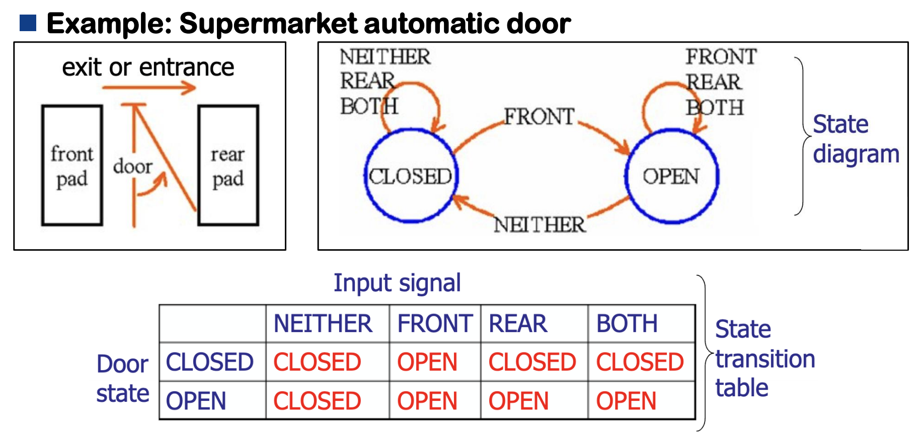 - 输入信号 (Input Signals): 什么事件会影响系统的状态?事件来源于门前后的两个压力感应垫(front pad 和 rear pad)。根据哪个感应垫被踩下,我们可以定义出四种不同的输入信号: