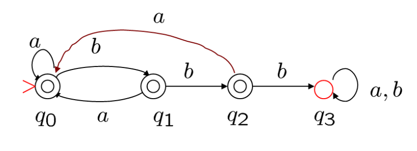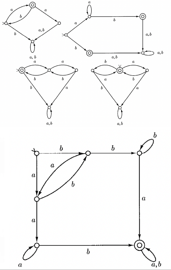 解释: 这个DFA的状态可以看作是在记录 count(a) - count(b) 的差值。例如,起始状态代表差值为0,向右的状态代表 a 比 b 多,向左的状态代表 b 比 a 多。接受状态就是差值为0的状态。图中的结构限制了这个差值的绝对值不能超过2。