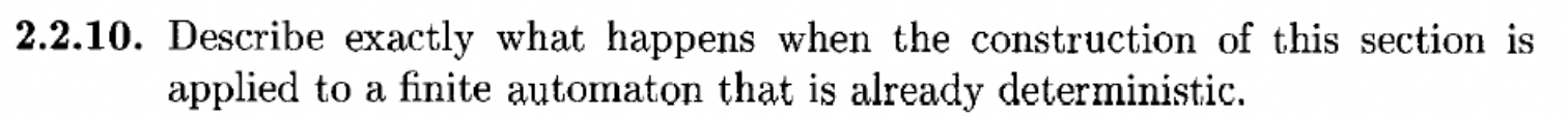 也就是说,当将子集构造法应用于一个已有的 DFA 时,我们会得到一个新的 DFA。如果我们忽略掉所有不可达的状态,那么剩下的这个新 DFA 与原 DFA 是同构 (isomorphic) 的。