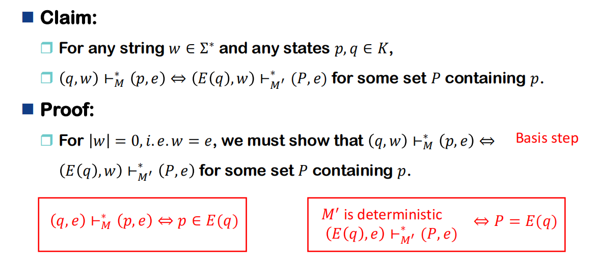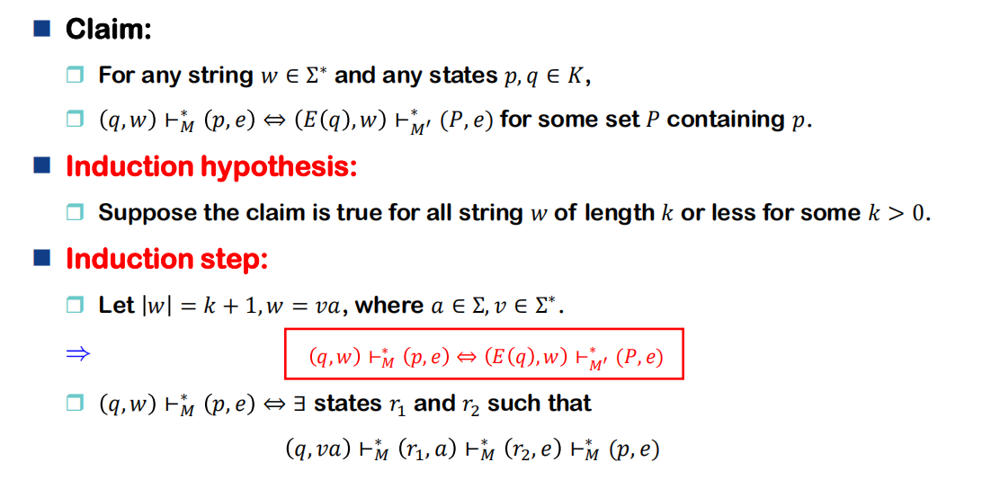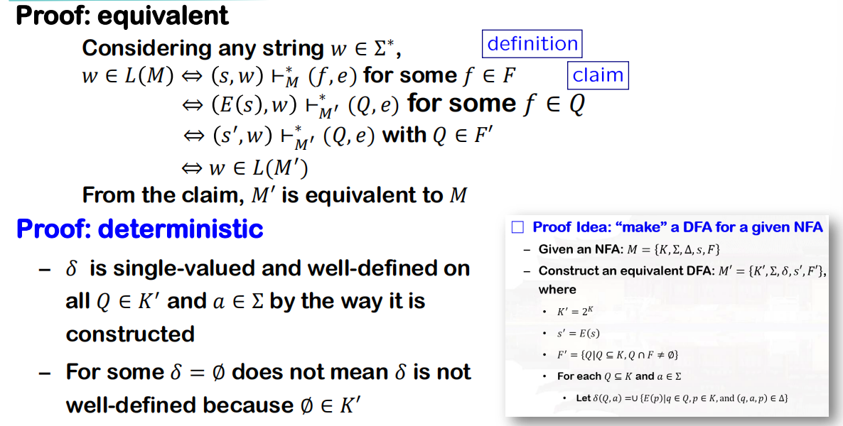 - 对任意一个 NFA,都能找到一个接受相同语言的 DFA。(这是证明的难点和核心)。