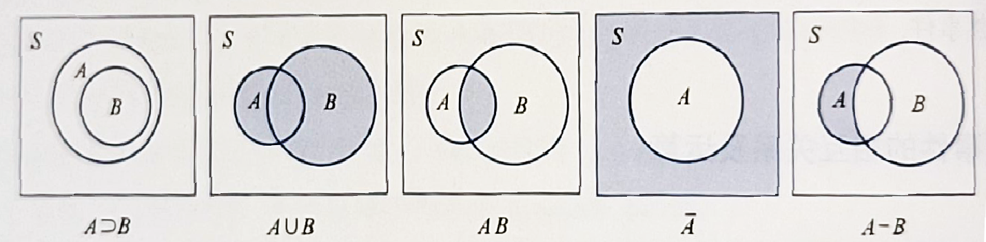 A的逆事件记作\(\overline{A}\),\(\begin{cases} A\cup \overline{A} &= S \\ A \overline{A} &= \emptyset \end{cases}\),若\(\begin{cases} A\cup B &= S \\ A B &= \emptyset \end{cases}\),称AB互逆。
