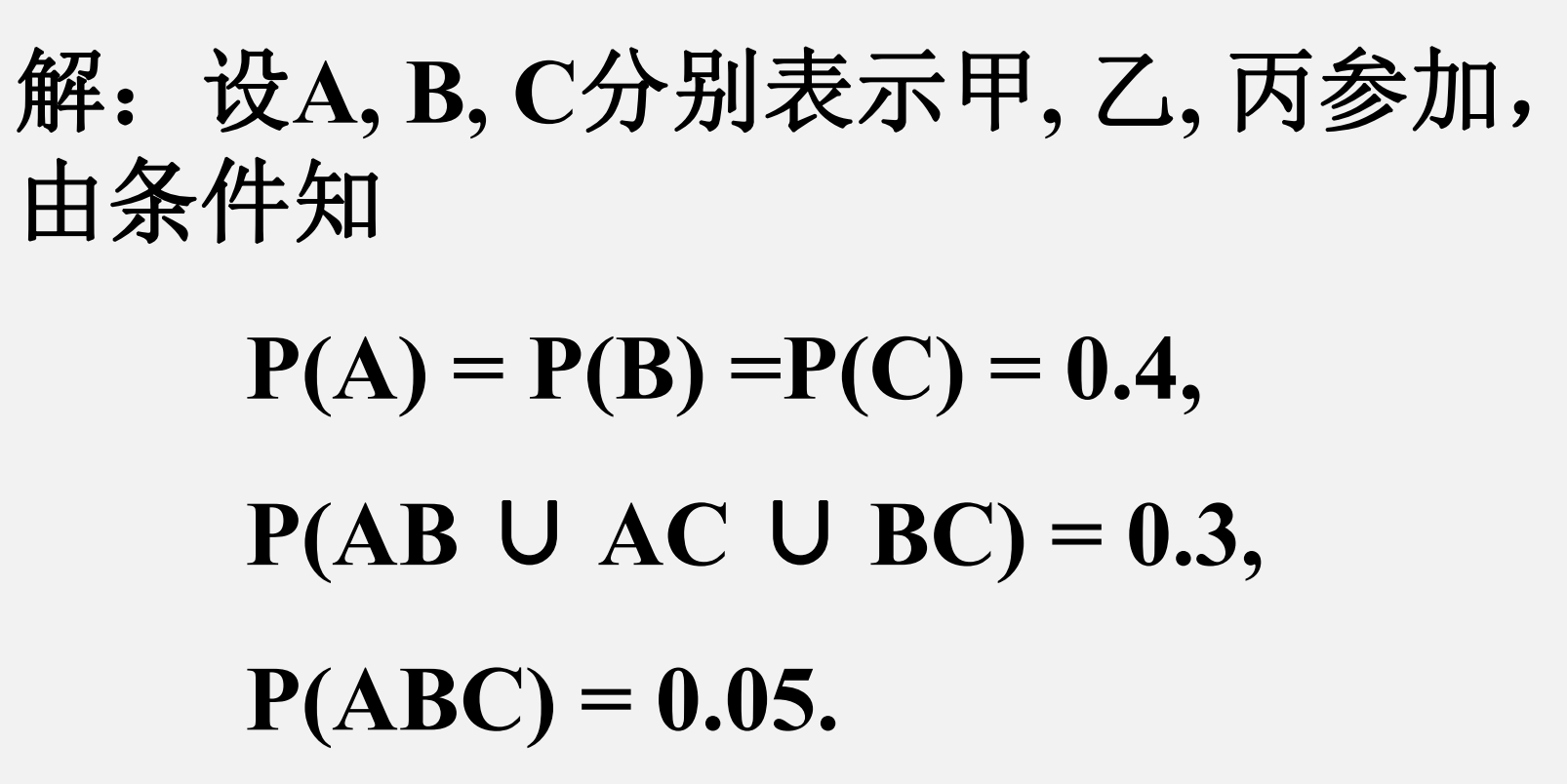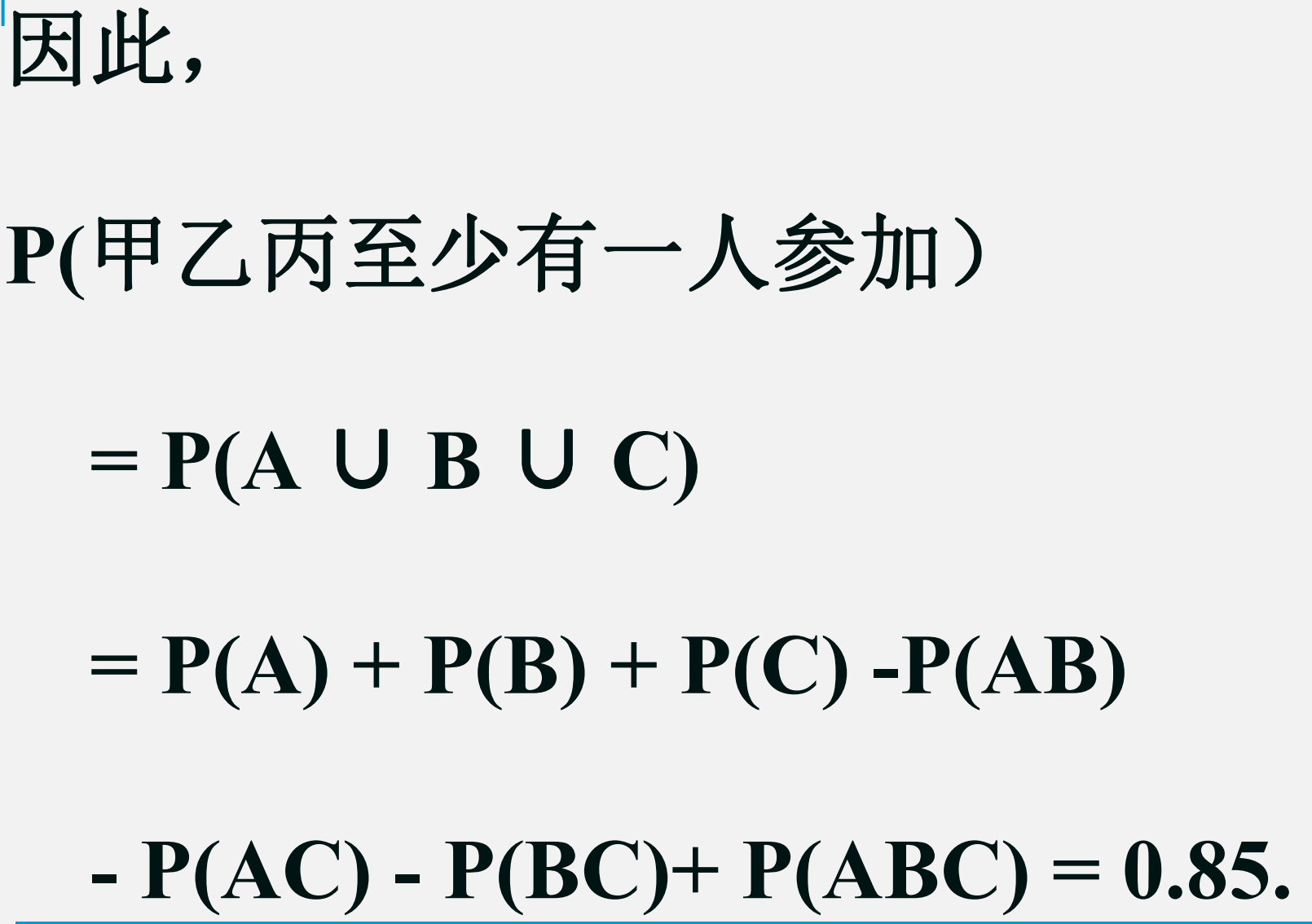 甲乙丙3人去参加某个集会的概率均为0.4,其中至少有两人参加的概率为0.3,都参加的概率为0.05,求3人中至少有一人参加的概率。