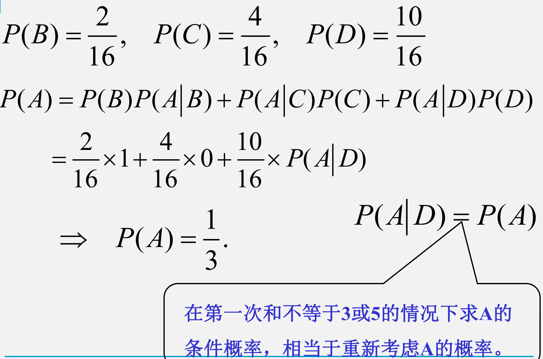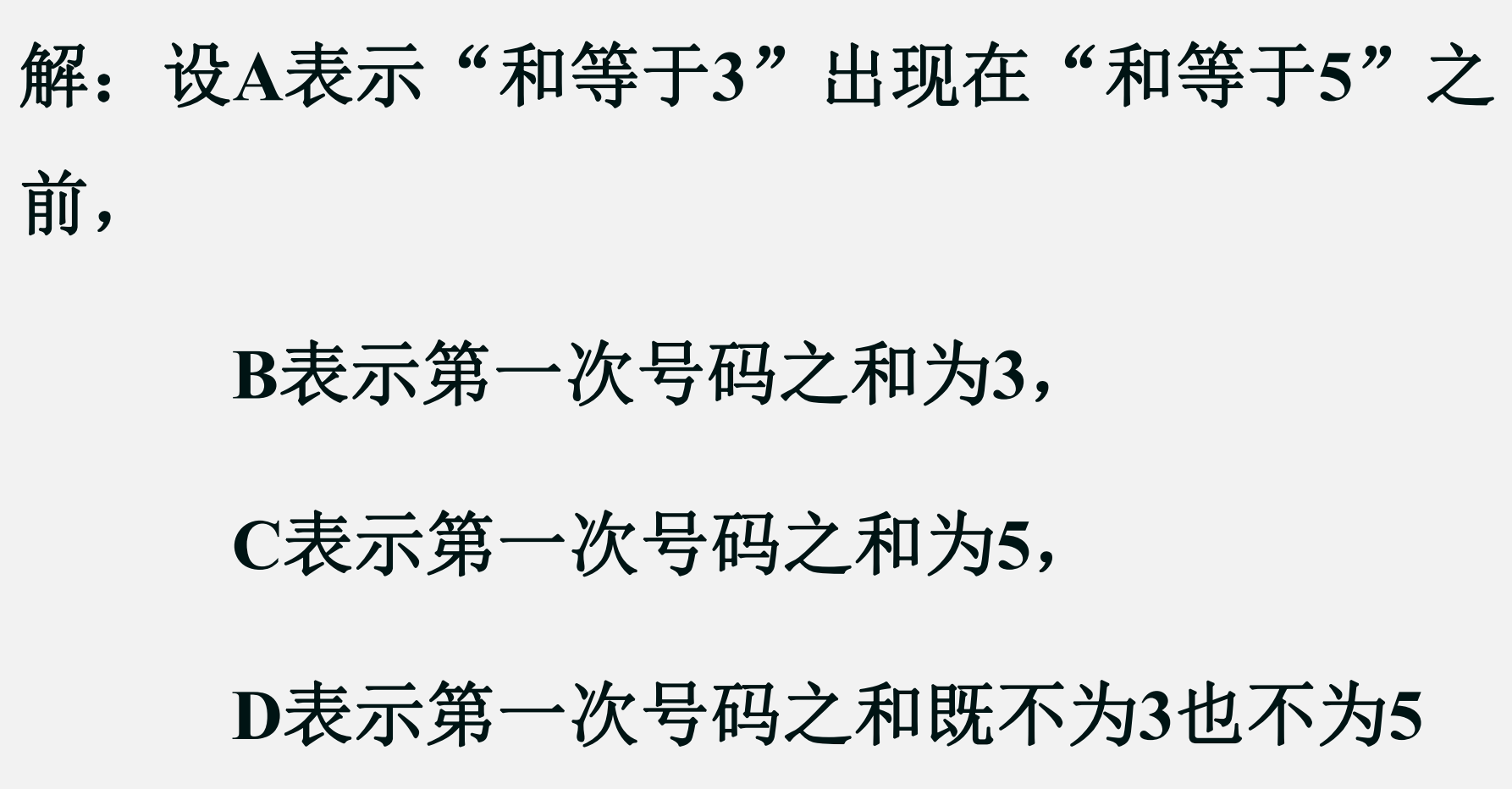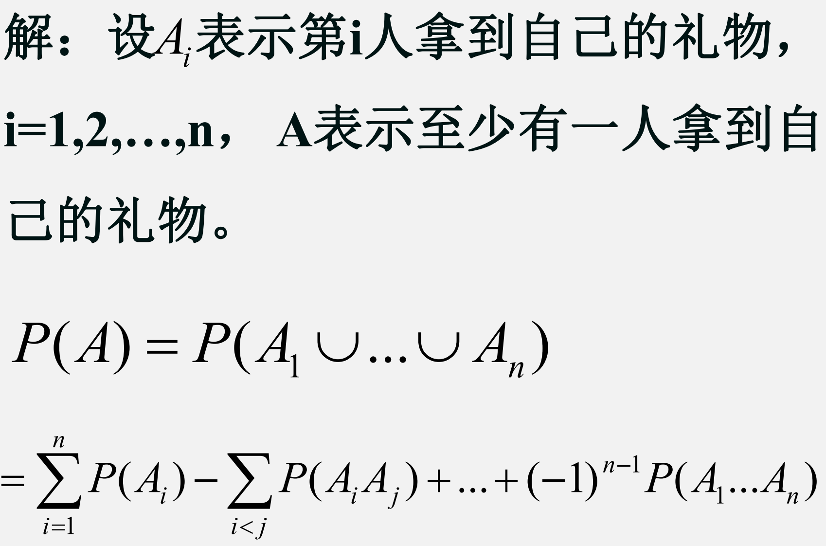 - 对于有限个两两不相容的事件的和事件,有 \(P(\mathop{\cup}\limits_{i=1}^{n} A_i) = \sum\limits_{i=1}^{n} P(A_i)\)