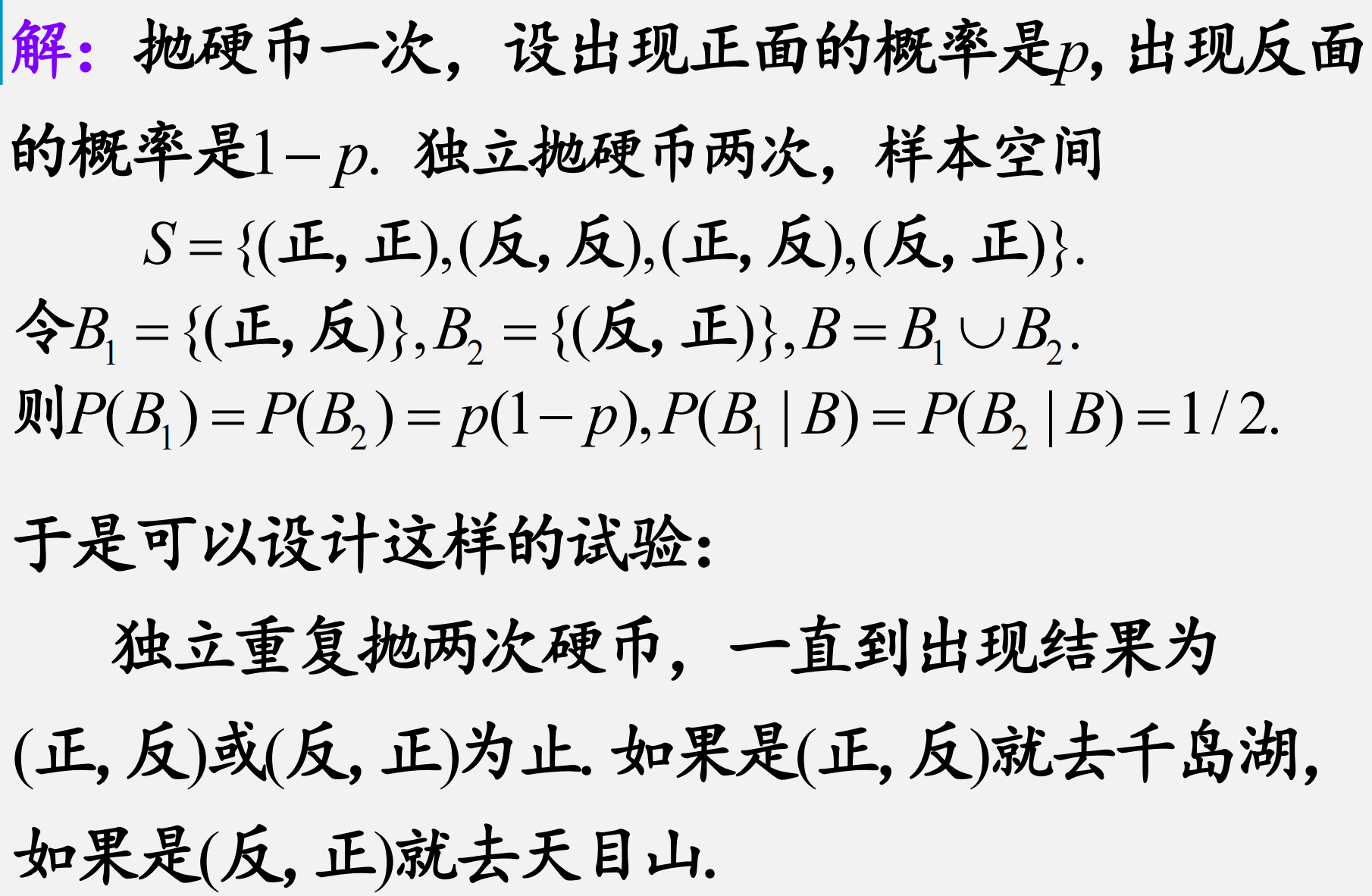 天气很好,小王想带家人去千岛湖玩,又想到天目山玩.他有一枚硬币,但不知道这枚硬币出现正面的概率.利用这枚硬币设计一个试验帮他做决定,使得最后他去千岛湖和去天目山的概率相等.