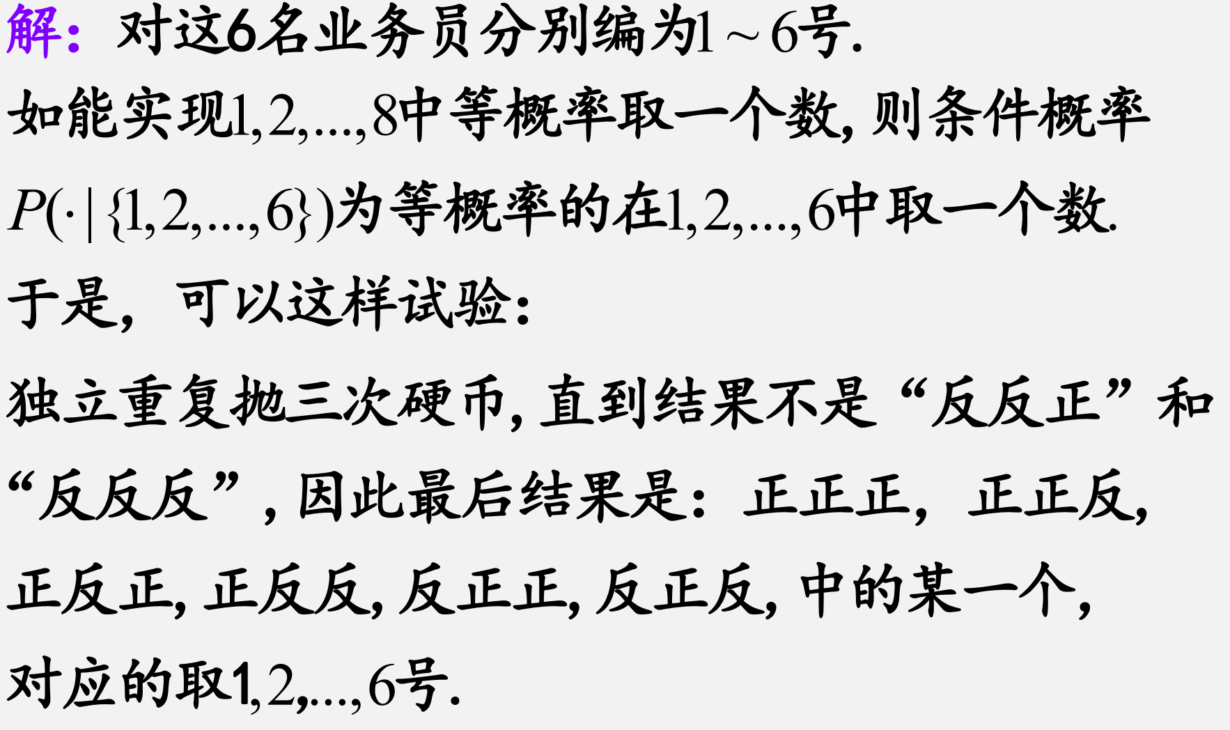 某单位想从8名业务员中等概率地选取一名去外地出差一年.现有一枚均匀硬币.利用这枚硬币设计一个试验帮这个单位做决定.