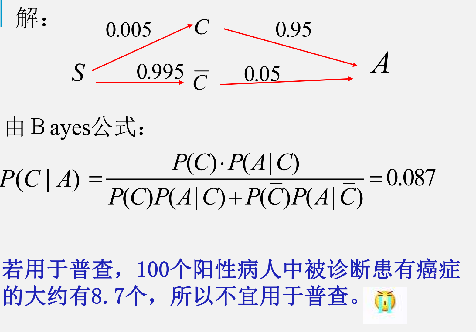 根据以往的临床记录,某种诊断癌症的试验具有5%的假阳性及5%的假阴性:即设A={试验反应是阳性},C={被诊断患有癌症}则有:\(P(A |C) = 5%, P(A | C ) = 5 %\) .已知某一群体\(P(C)=0.005\),问这种方法能否用于普查?
