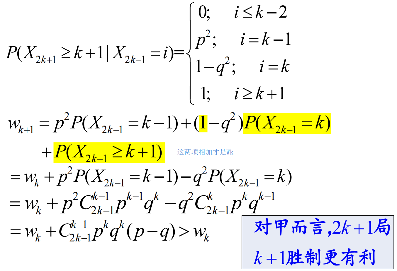 甲和乙比赛,甲的实力更强一点。每一局甲赢的概率为p,这里\(0.5\le p \le1\)。设各局胜负相互独立。设k是一正整数.问:对甲而言,\(2k-1\)局\(k\)胜制有利还是\(2k+1\)局\(k+1\)胜制有利?