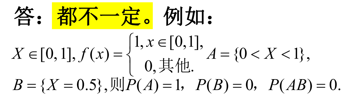 3. AB互斥则P(AB)= 0,但反之不成立。例如A为在(0,1)上去掉0.4,B为在(0,1)上取出0.5
