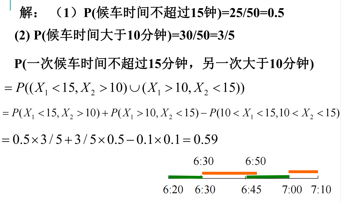 (2)如果王先生一月中有两次按此方式独立地去候车,求他一次候车不超过15分钟,另一次候车大于10分钟的概率。