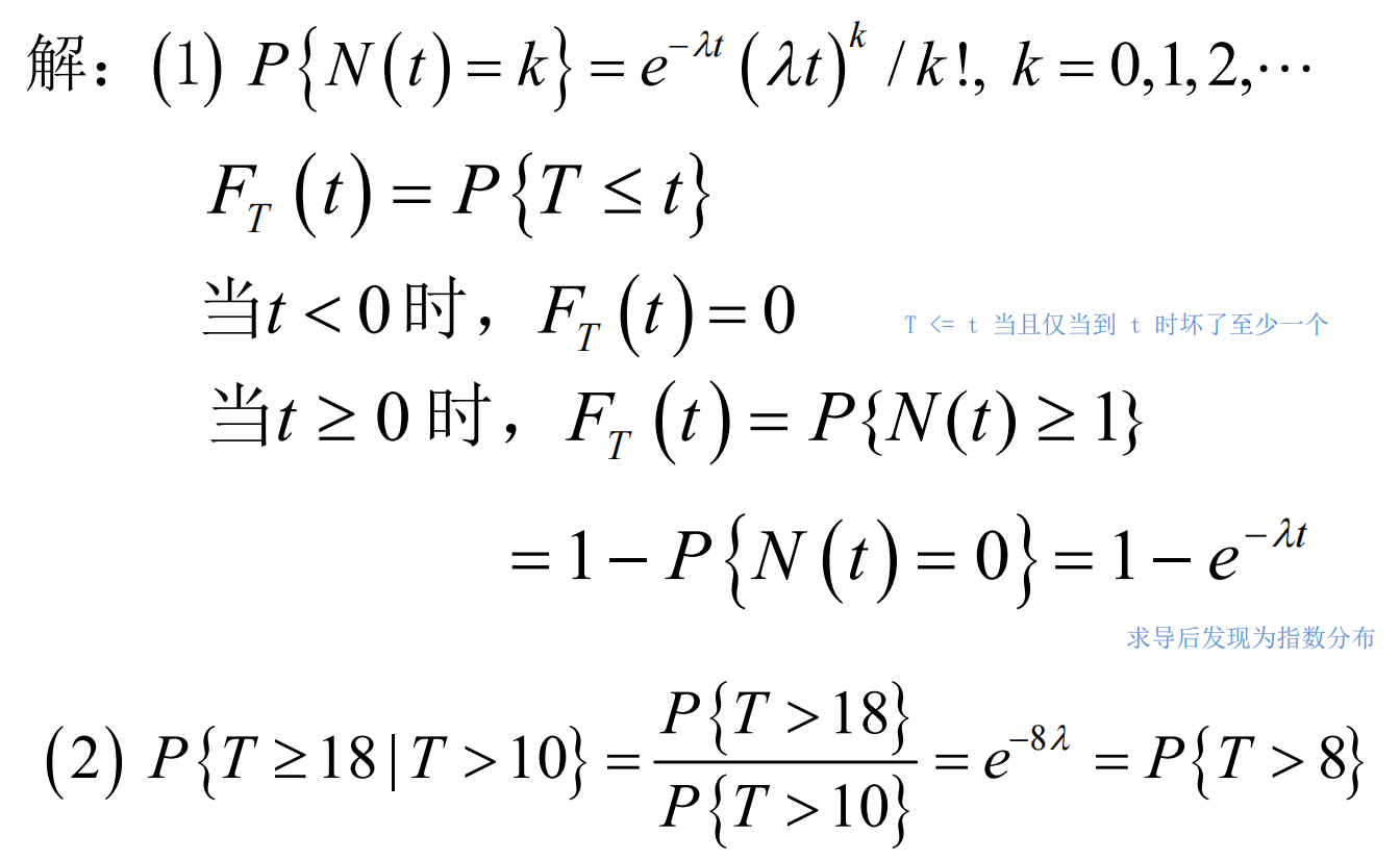 某大型设备在任何长度为\(t\)的区间内发生故障的次数\(N(t)\)服从参数为\(\lambda t\)的Poisson分布,记设备无故障运行的时间为 \(T\) .